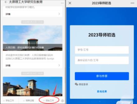 1、学生请关注永利官网硏究生院微信公众号“太原理工大学硏究生教育”后,点击右下角菜单”招生工作一2023硕导初选"填报初选志愿,学生填报起止时间为7月7日一7月11日,具体操作如下图所示: