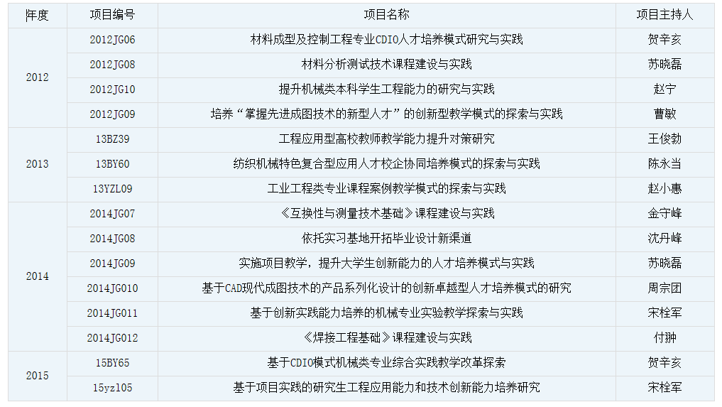 面向纺织机械行业和区域经济需求,积极推进教育教学改革。在学校“5+X”、“艺工结合”人才培养模式改革总体框架下,学院始终把本科教学工作作为学院的核心工作,鼓励教师积极开展教育教学改革,倡导科研教学并重,科研反哺教学,积极开展青年教师教学能力提升工作。近三年来,学院教师主持完成9项教学改革项目,获得省部级以上教学成果奖10余项,出版教材专著近10部,发表教学研究论文10余篇。学院已形成创新务实的教学科研体系。(附教学改革研究项目)