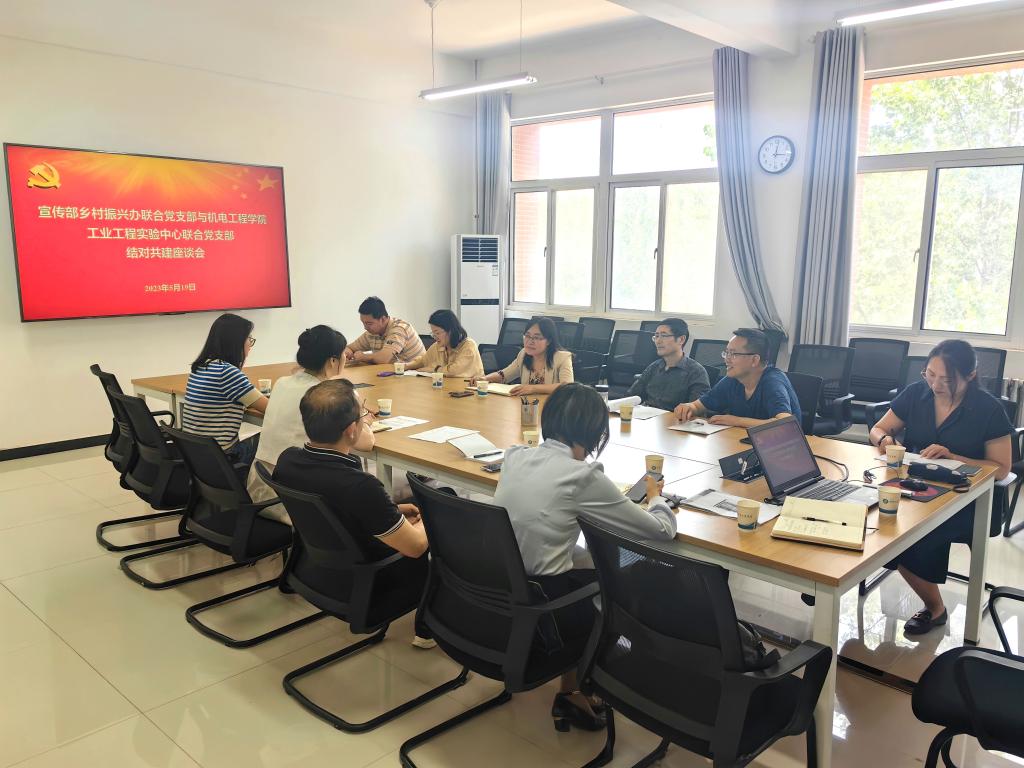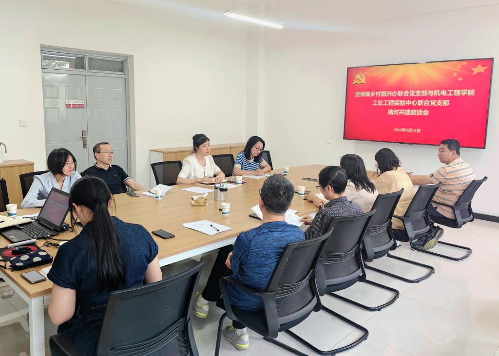5月19日,宣传部乡村振兴办联合党支部与工业工程实验中心联合党支部在机电学院310室开展结对共建座谈会。党委宣传部常务副部长王鸣媛、乡村振兴办主任赵宏、机电学院党委书记阚佩、副院长赵小惠及结对双方支部党员参加了会议,会议由阚佩主持。