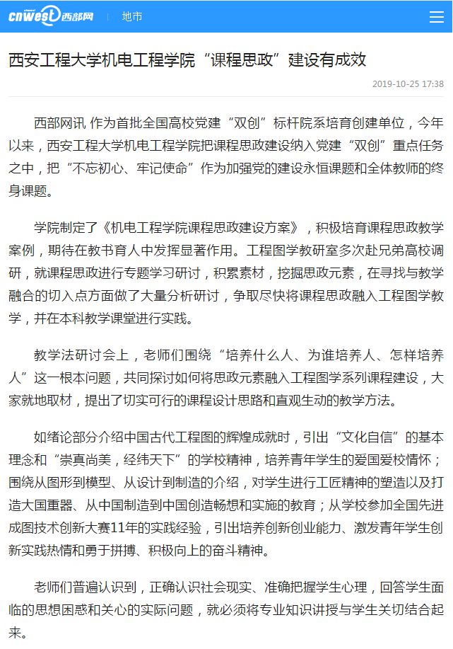 学院制定了《beat365在线唯一官网课程思政建设方案》,积极培育课程思政教学案例,希望在教书育人中发挥显著作用。工程图学教研室多次赴陕西省兄弟高校开展调研,就课程思政进行专题学习研讨,积累素材,挖掘思政元素,在寻找与教学融合的切入点方面做了大量分析研讨,积极争取将课程思政融入工程图学教学,并在教学课堂尽早实践。