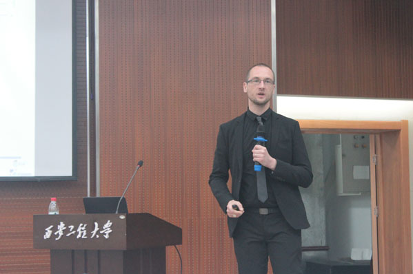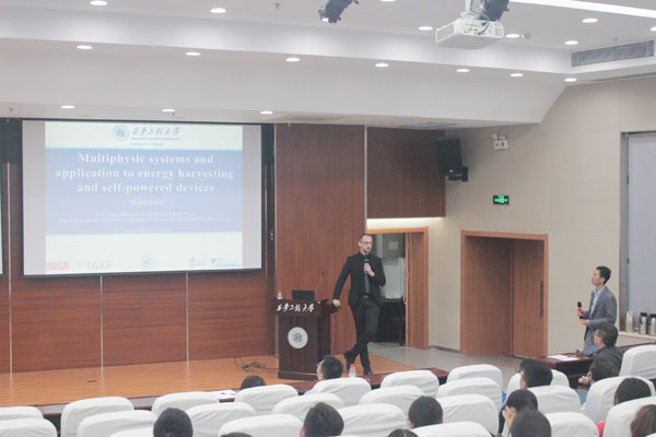 Mickaël LALLART博士是法国里昂国立应用科学学院(INSA Lyon,法国工程师学院前五甲,QS世界大学工程领域排名位列101-150。)副教授,主要研究领域为能量俘获、振动控制、压电驱动等,多年来发表SCI期刊论文近百篇,被引次数2000余次,在国际该领域具有一定的影响力。本次活动中,Mickaël LALLART博士首先介绍了里昂国立应用科学学院的悠久历史和在诸多领域的研究方向和成果,作为法国最早成立的工程类高校之一,其在工程师培养、工程领域应用所取得的成绩。随后,Mickaël LALLART博士从社会经济发展对复合材料和多源能量驱动的迫切需求切入,详细介绍了能量俘获在工程领域的巨大作用和广泛需求、最优能量俘获的评价与分析模型,并结合本人团队最新的研究成果,介绍了当前世界能量俘获领域的研究进展、能量俘获与存储理论模型和工程应用技术。报告结束后,Mickaël LALLART博士与现场师生进行了交流互动,回答了师生提出的问题。活动结束后,肖渊、张守京等与Mickaël LALLART博士围绕青年教师进修、科研项目国际合作、国际化课程设置等内容进修了交流和探讨。