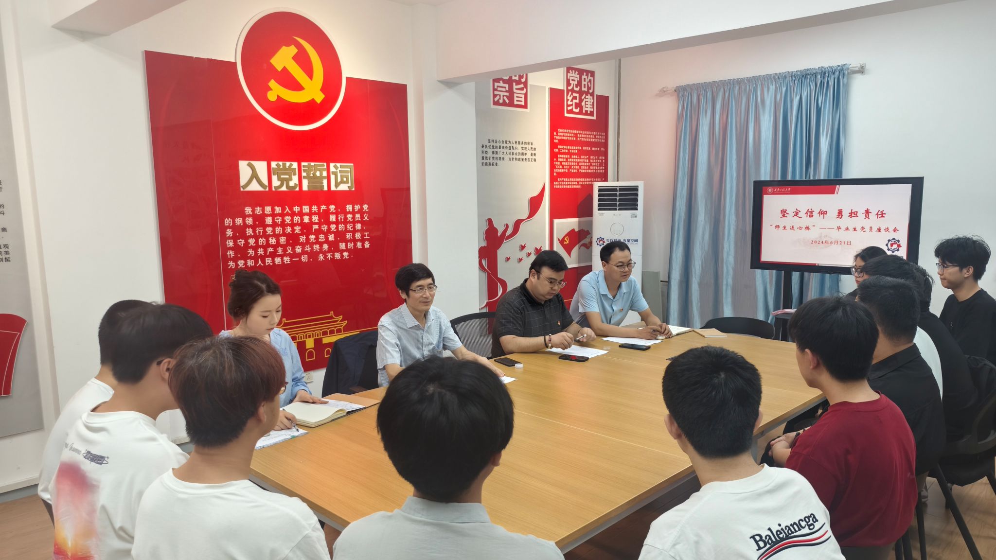 为充分了解2024届毕业生现状,广泛听取毕业生对学校和学院发展建设、教育培养、管理服务等方面的意见和建议,6月21日上午,beat365在线唯一官网在“先锋机电 五星空间”党建引领“一站式”学生社区党建活动室开展“坚定信仰、勇担责任”2024届毕业生党员座谈会。学院党委书记阚佩、党委副书记冯翊、组织员秦方刚、毕业生辅导员李菁菁及2024届毕业生党员代表参加了本次座谈会。