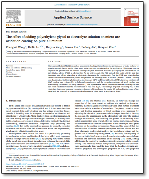 近期,beat365官网陆海林副教授指导的硕士研究生在国际TOP期刊《Applied Surface Science》上发表题为《The effect of adding polyethylene glycol to electrolyte solution on micro-arc oxidation coating on pure aluminum》的研究论文。