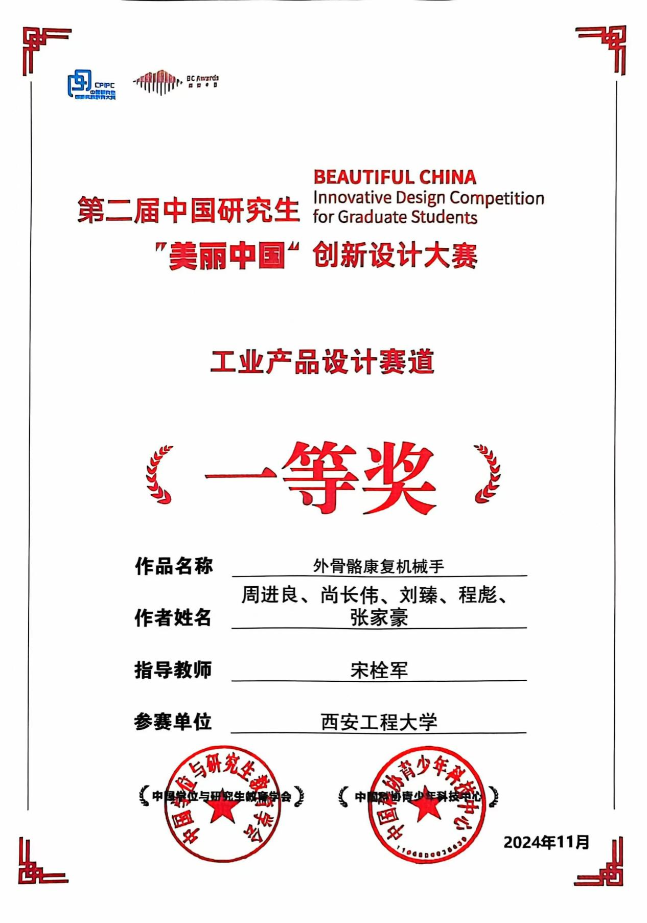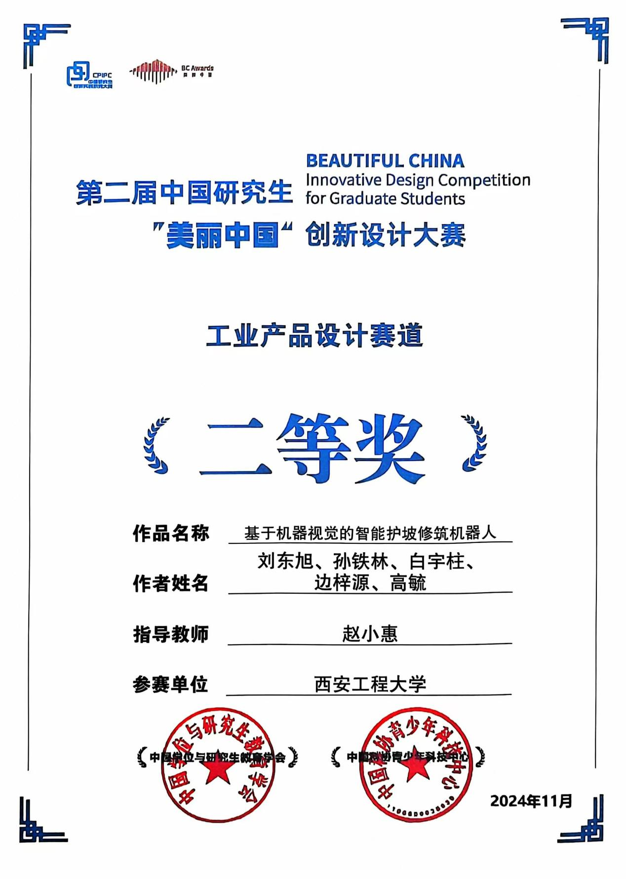 中国研究生“美丽中国”创新设计大赛由中国学位与研究生教育学会主办,是“中国研究生创新实践系列大赛”主题赛事之一,旨在激发研究生创新设计意识,提高研究生创新与设计实践能力,培养研究生社会担当与弘扬中华美育精神,为国家、社会和企业培养和发掘创新型设计人才,同时推动高校之间、校企之间创新成果转化落地。赛事主要围绕环境空间设计、服装与服饰设计、工业产品设计、媒体传达设计等四个专业赛道。其中,工业产品设计赛道共收到1430份有效参赛作品,243家培养单位的310支队伍晋级决赛。周进良等5名同学的作品“外骨骼康复机械手”、刘东旭等5名同学的作品“基于机器视觉的智能护坡修筑机器人”最终在该赛道分获一等奖和二等奖。