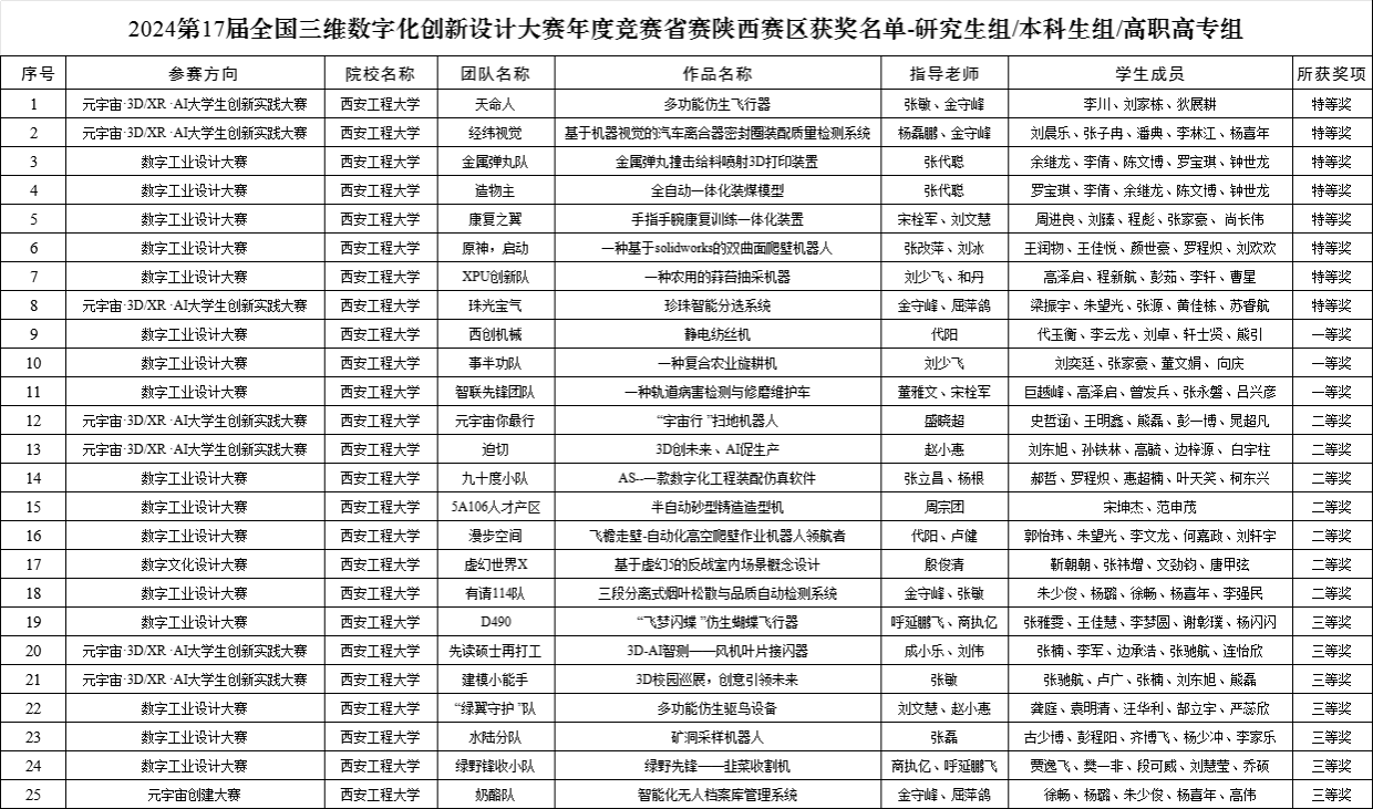 第17届全国三维数字化创新设计大赛陕西赛区竞赛近日举行,beat365官网学子获得特等奖8项、一等奖3项、二等奖7项、三等奖7项,获得特等奖的队伍入围全国总决赛,是beat365官网该项赛事举办以来取得的最好成绩。