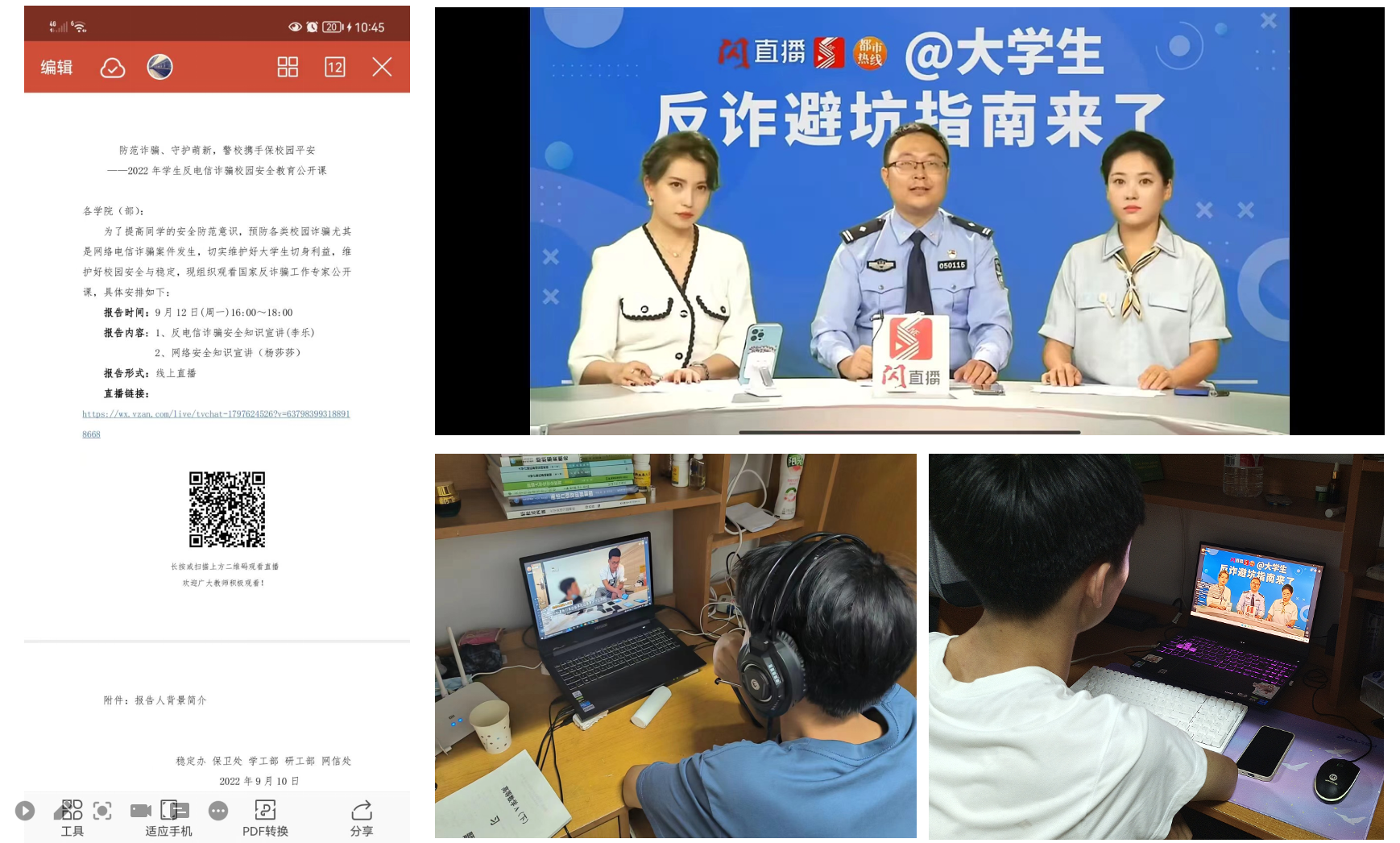 9月9日、12日、14日,学院积极组织2022级新生收看由市公安局等部门联合举办的【@大学生反诈避坑指南来了】主题线上直播活动,由beat365在线唯一官网举办的《防范诈骗、守护萌新,警校携手保校园平安——2022年学生反电信诈骗校园安全警示公开课》,由beat365在线唯一官网举办的《开学季防诈防骗知识宣讲会》《新生安全教育》,通过众多典型案例,不断提升学生安全防范意识,预防各类校园诈骗案件发生,切实维护好大学生切身利益,维护好校园安全稳定。9月12日,学院邀请大学生心理健康教育与咨询中心副主任田珍珍从新生面临的三大变化、新变化带来的新冲突、新生心理调适方法集锦等3个方面做了大学新生心理适应的专题报告,同学生感兴趣的话题进行了深入互动,帮助新生明确方向,从“心”保驾护航。