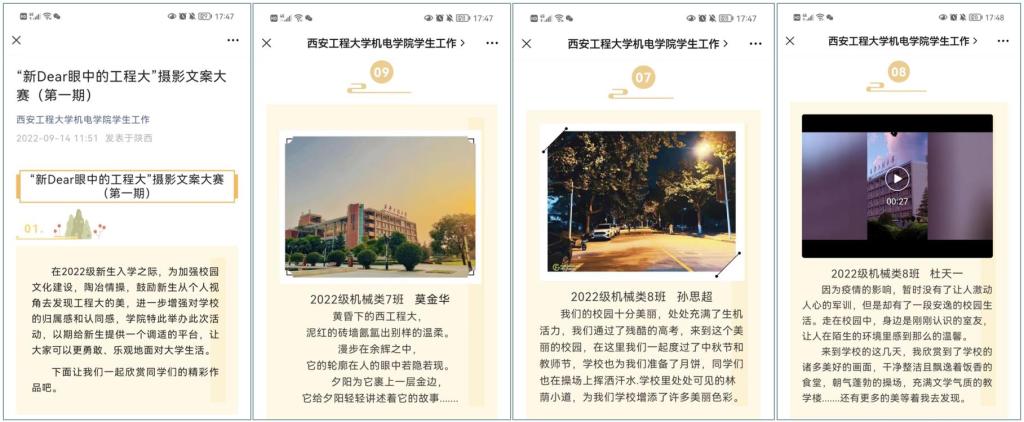 9月10日—9月12日,学院举办了“新Dear眼中的工程大”摄影文案大赛,鼓励新生从个人视角去发现工程大的美,让美景触手可及,让故事留心回忆。自9月14日推出第一期作品展以来,活动在学院新生中反响强烈,近2000人阅读,近1000人参与投票,充分感受到新生对学校的认同感和归属感,这也是对校园文化建设的有力推进,也让学生更勇敢、乐观地面对大学生活。